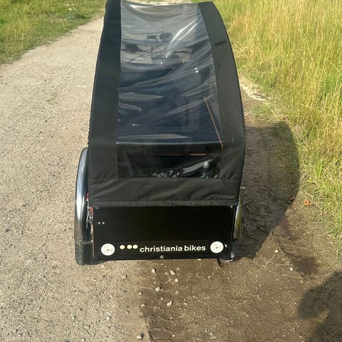 Super velholdt Christiania Taxi / Ladcykel med næsten ny kaleche, sikkerhedssele, hynder, tæppe, flaskeholder, lommer til passagerne, basta lås og stor kædelås. Med opbevaring under sæde. Sparsomt brugt og altid opbevaret i garage.