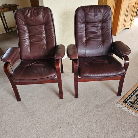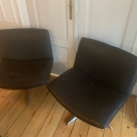 2 brune læder lænestol med firkantet design og polstrede armlæn. Stolen er patineret på armlænene og siddepuden, og den er blevet brugt gennem hos mig de sidste 30 år. Stolen kommer oprindeligt fra et hotel, og er fremstillet i et langtidsholdbart og tidsløst design. Produceret en gang i 70'erne.