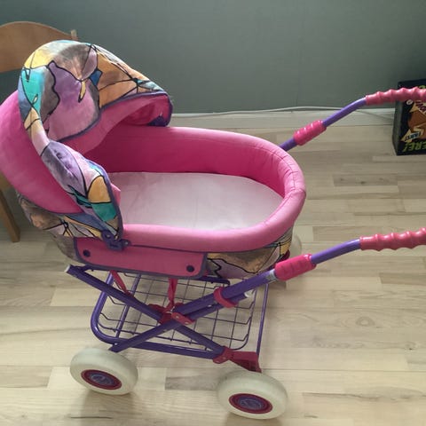 dukkevogn i sort stof med metalstel og hjul. Vognen har en justerbar kaleche og en farverig kæde som legetøj. Egnet til børn til leg og transport af dukker.