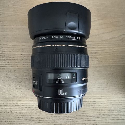Canon EF 100mm f/2.8 Macro USM objektiv i sort farve. Objektivet er designet til makrofotografering med en brændvidde på 100 mm og en maksimal blænde på f/2.8. Det har ultralydsmotor (USM) for hurtig og stille autofokus. Objektivet inkluderer en modlysblænde (ET-67) og et Hoya 58mm UV-filter.