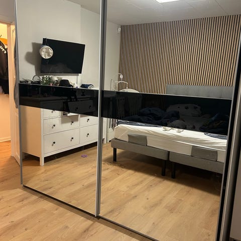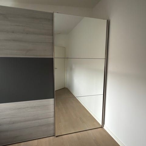 Fint garderobeskab med skydelåger, den ene i som spejl-låge. Er usamlet men alt er der til at samle, dog ikke vejledning. Men lidt snilde kan det fint gå. Hænge hylde til bøjlestang medfølger.