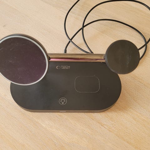 Super fin lille ladestation til Apple fon, AirPods og Watch. Med lys i bunden (kan ses svagt på billederne). Som ny. Nypris kr 450,-