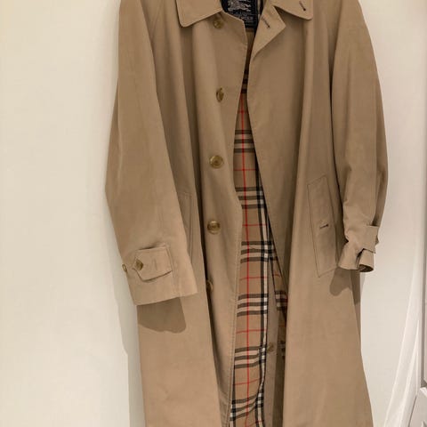 Vintage Burberry herre frakke fra 70’erne , størrelse 56 til mænd. Fremstillet i bomuld med klassisk Burberry ternet foer. Designet som en lang frakke med dobbeltradet knaplukning og bælte ved taljen. Velegnet til udendørs brug i køligere vejr. Spænderne er en smule slidt som ses på billederne, men ellers super fin stand - str 56 mænd. Frakken er af bomuld og polyester, det aftagelige foer er 100% uld