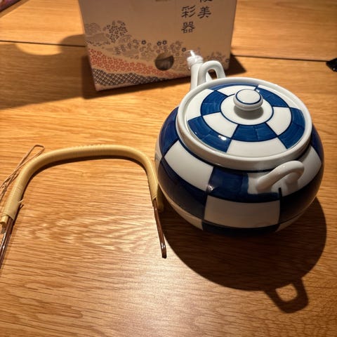 Unik lille fin japansk tekande med bambushåndtag og to matchende kopper. Tekanden og kopperne er lavet af keramisk materiale med en sort overflade og dekorative blomsterdetaljer. Tekandens højde inklusive håndtag er cirka 12 cm, og koppernes diameter er cirka 7 cm.