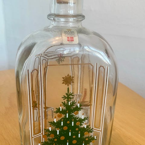 Glasflaske med dekorativt julemotiv fra år 2000.
