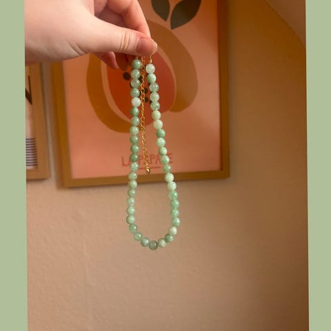 Den med brunlige perler og guldkugler er 120 cm lang