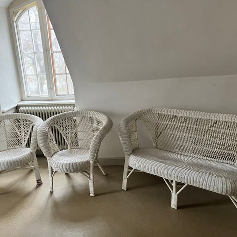 Unikke kurvemøbler med læddersæder og understel i træ.