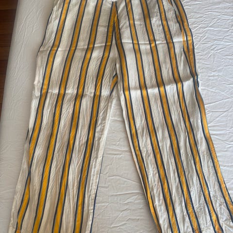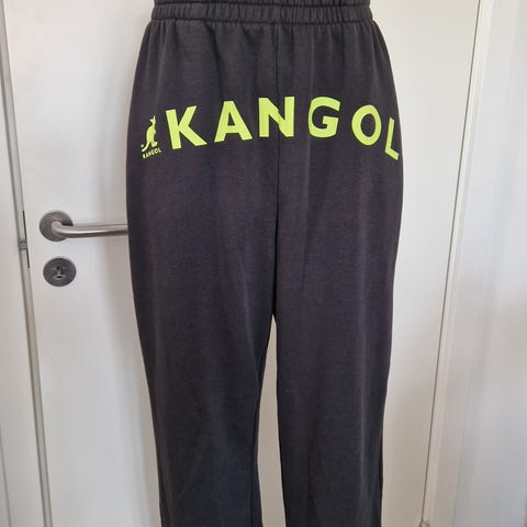 Fede bukser i mærket Kangol med ligo over det hele, en speciel kollektion lavet til H&M. Kun brugt kort en gang så fejler intet. Med lommer. Str. S Med elestik kant nederst på benene og i livet. Materiale 60% Bomuld og 40% polyester