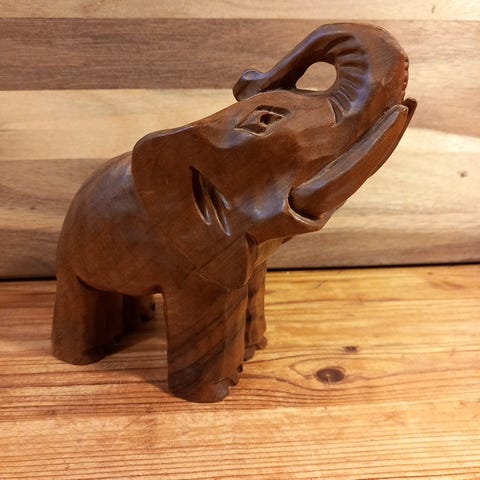 Sæt bestående af to håndlavede elefantfigurer i træ, en i brun og en i sort. Figurene er detaljerede med udskårne øjne og stødtænder, velegnede som dekorative genstande. Materialet er træ, og størrelsen er lille til mellemstor, passende til placering på hylder eller borde, højde på den største er 9 cm, højde på den mindste er 6 cm