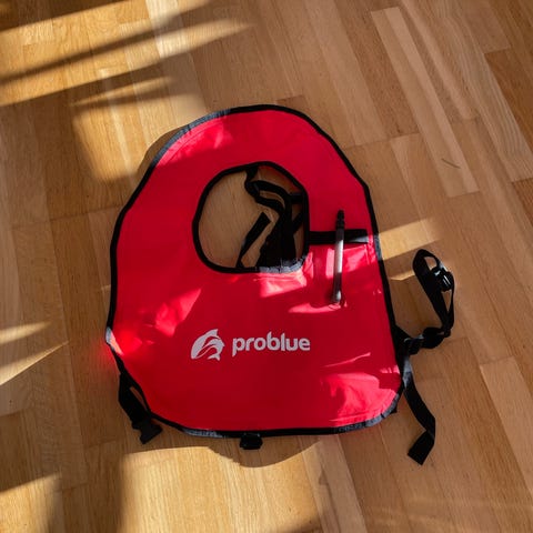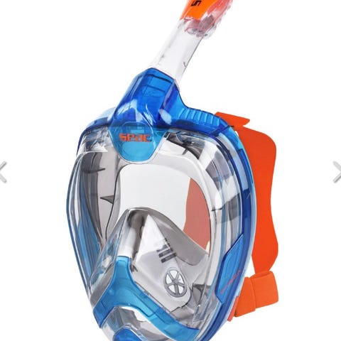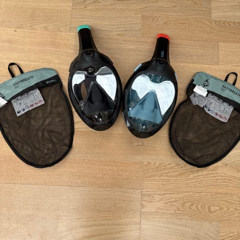Snorkelmasker med integreret snorkel i turkis farve, størrelse L/XL. Masken leveres med en hvid snorkel og en sort netpose til opbevaring. Masken er designet til at dække hele ansigtet og giver mulighed for at trække vejret gennem næse og mund under snorkling. Materialet er plast og silikone, som sikrer tæt pasform og komfort ved brug.