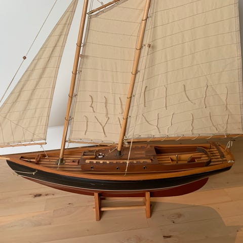 Modelskib i træ med sejl og stander