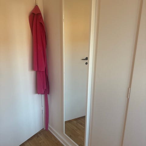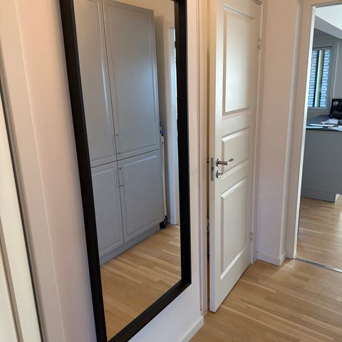 Plain IKEA spejl uden ramme, rektangulært formet. Spejlet har en glat overflade og kan placeres på gulv eller væg. Sælges uden hængsler. 60x95cm