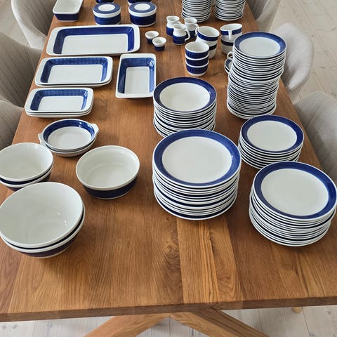 Blå koka service sæt til 6 personer i keramik med blå og hvide farver. Indeholder tallerkener, skåle, kander, kaffekopper, serveringsfade og gryder. Designet til køkkenbrug og servering.