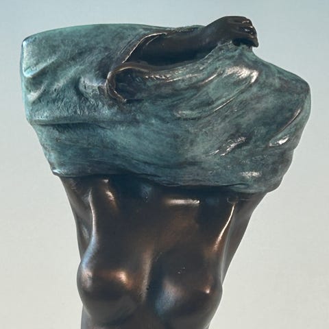 Bronze skulptur af en kvinde, der rækker armene op til det ene ben i en elegant akrobatisk bevægelse. Skulpturen er monteret på en sort base. Materialet er bronze, og designet fremhæver en elegant, abstrakt form. Velegnet som dekorativ genstand til hjem. Købt på aktion for nogle år siden, husker ikke kunstneren. Måler fra bord til top ca 30 cm, bredde ca 18 cm