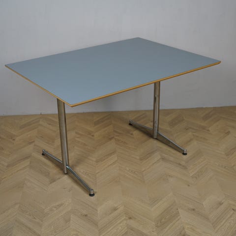 Specialfremstillet bord med hvid laminattop og sort kant. Basen er i krom. Enkelte brugsspor, men fremstår ellers i fin stand.