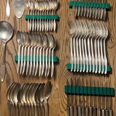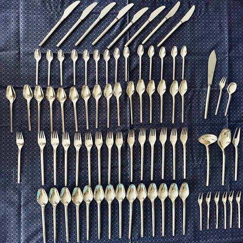 133 dele af det smukke bestik Savoy tegnet af henning seidelin (1904-1987) for poul frigast sølvvarefabrik. 14 middagsknive 22 cm, 12 middagsgafler 20 cm, 25 frokost gafler 28 cm, 12 kagegafler 15 cm, 20 middagsskeer 20 cm, 11 dessert skeer 18 cm, 18 teskeer 12 cm, 1 marmelade ske 16 cm, 1 sukkerske 13 cm, 2 sovseskeer 18 cm, 4 potageskeer 21 cm, 1 lagkagekniv 27 cm, 1 oplukker 15 cm, 2 saltskeer 7 cm, 1 stegegaffel 20 cm, 6 små gafler 15 cm, 1 kagespatel 18 cm. Sælges samlet uhørt billigt for 2.500 kr