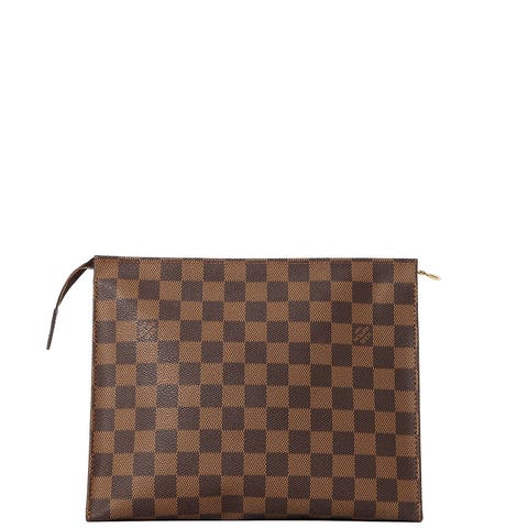 Denne Louis Vuitton clutch i Damier Ebene-print er et klassisk valg, der kombinerer struktur, enkelhed og et tydeligt LV-udtryk. Det ikoniske ternede mønster stammer helt tilbage fra 1888 og er blevet en af husets mest genkendelige signaturer. Taskens rene linjer gør den nem at style – brug den alene som en elegant aftenclutch eller som organiser i en større taske til hverdagen. Den giver ethvert look et sofistikeret, tidløst Louis Vuitton-touch.