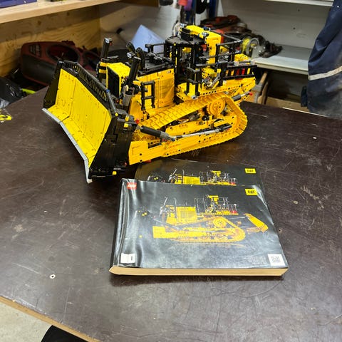 LEGO Technic Bulldozer Model i gul og sort farve. Byggesæt med detaljerede funktioner, herunder bevægelige bælter og skovl. Egnet til samling og udstilling.