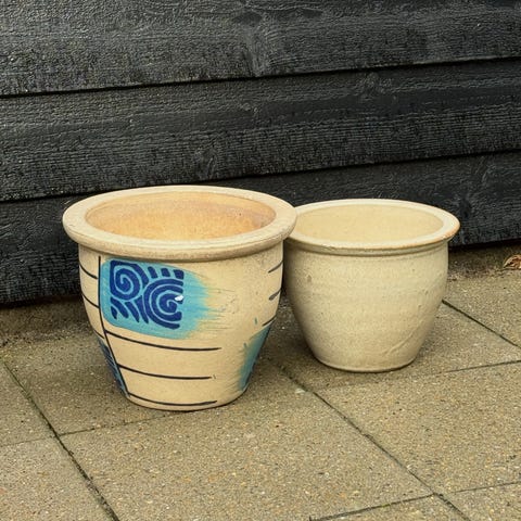Vi har 2 ens krukker i koksgrå farve, mål står på billedet.