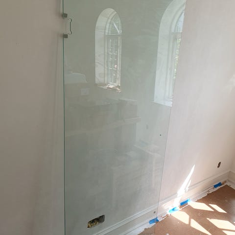 Brusedør i hærdet klar glas med poleret kant inkl. hængsler.