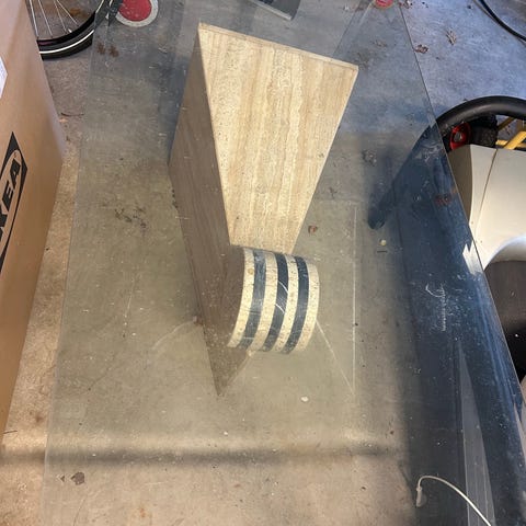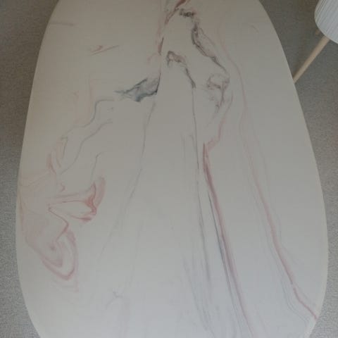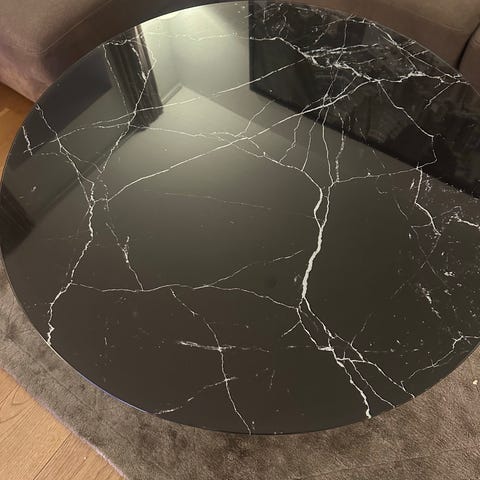 Sofabord med sort metalstel og bordplade i slebet glas. Med marmor mønster.