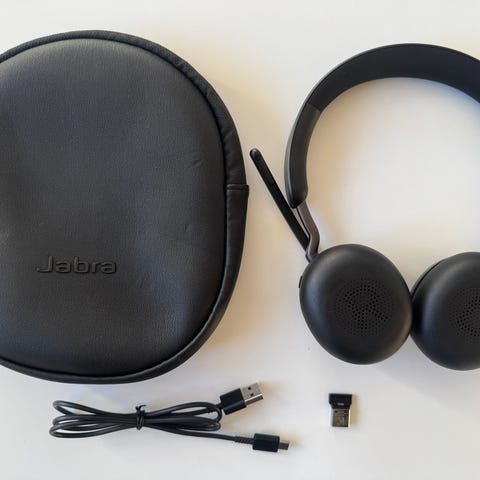 Jabra Evolve2 65 trådløse headset i sort farve. Headsettet har en fleksibel mikrofonarm og ørepuder i blødt materiale. Designet til brug i professionelle miljøer med fokus på komfort og lydkvalitet. Leveres med opbevaringsetui og USB-kabel til opladning og forbindelse.