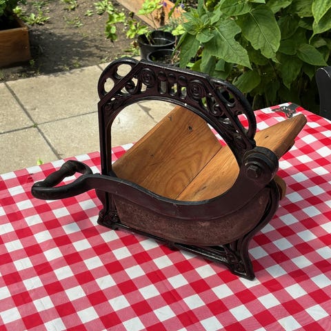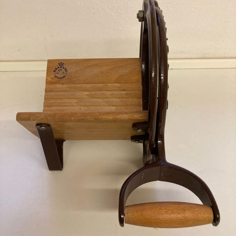 &Tradition brødskærer lavet af træ og metal. Designet til manuel skæring af brød med en håndsvingmekanisme og en træskæreflade. Produktet har et robust metalstel og et håndtag i træ for bedre greb.