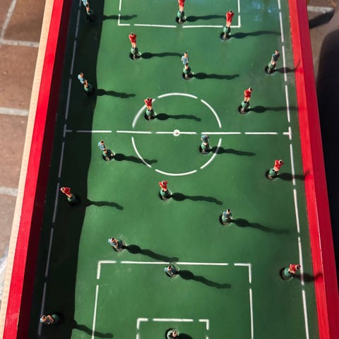 Soccer bordfodboldspil med flamme- og boldmotiv på siderne. Spillet er designet til indendørs brug og har flere stænger med spillere i rødt og blåt, samt sorte håndtag. Det har en grøn spilleflade med hvide markeringer.