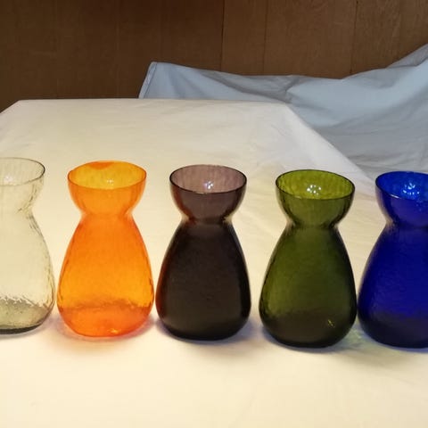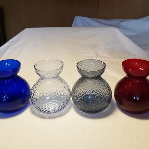 3 stk. ( 1 stk. er solgt ) vintage oval formet hyacintgals med hamret overfalde i rød/orange farvet gals. Oprindeligt fremstilt på Fyns Glasværk men solgt for Kastrup Galsværk. Alle glas står i rigtig pæn stand uden skår eller afslag på kanterne. Ingen galspenst og med minimal overfladisk slid.
