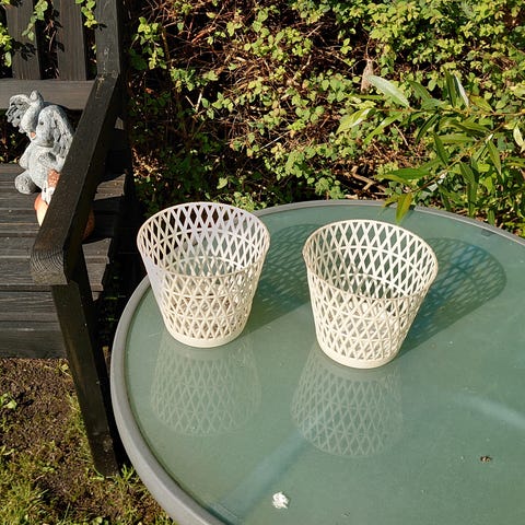Urtepotteskjuler i keramik, Ukendt, Retro/vintage urtepotteskjuler i keramik (rødler) hvidmalet i mat hvid fra ca. 1950'erne. På bunden kan man se at den er lavet af rødler og har haft et mærke siddende der, da bunden ikke er malet. Diameter: 13 cm, totalhøjde: 9,6 cm, indvendig højde: 9 cm.