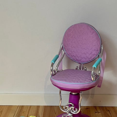 Our Generation dukke med langt lyst hår, frisør-salon-stol, saks og hårtørrer, samt hårklemmer