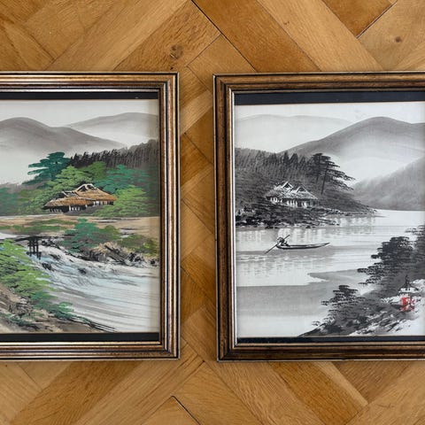 Japansk broderi (silke og metaltråd). Meget fin stand, men brugsspor på rammen.
