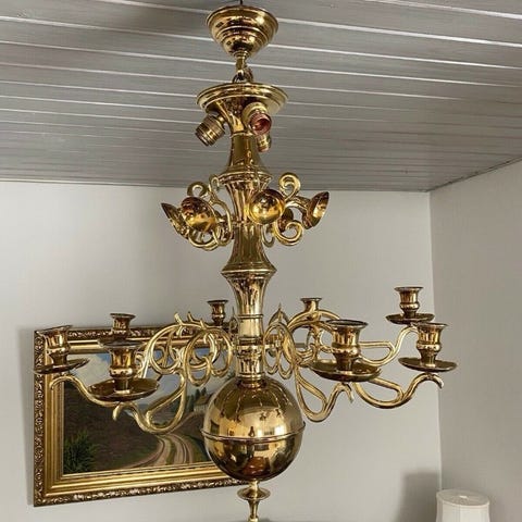 Vintage messing lysekrone med 6 arme. Lampen har en klassisk design med kædeophæng og plads til 6 pærer i stearinlysform. Velegnet til opholdsrum med behov for dekorativ belysning.