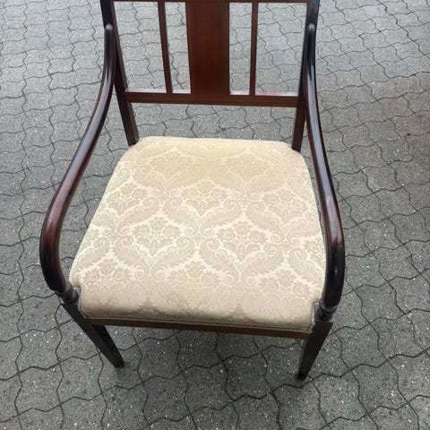 Antik mahogni stol med nyt rødt betræk i uld sælges billigt pga. pladsmangel. Den er i god stand. Hentes på Amager, sender ikke
