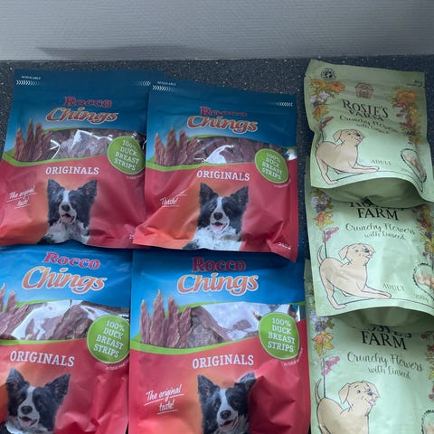Har 3 hele og en halv pose hunde godbidder af mærket