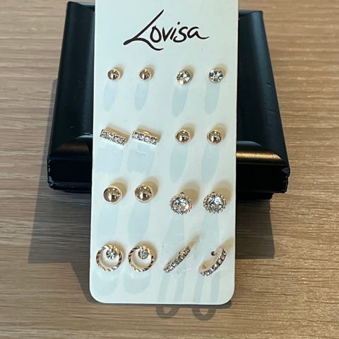 Ørestikker, 6 par øringe i forskellige farver: hvid, gul, orange, lyserød, pink og grøn. Knoppen er af sort gummi.