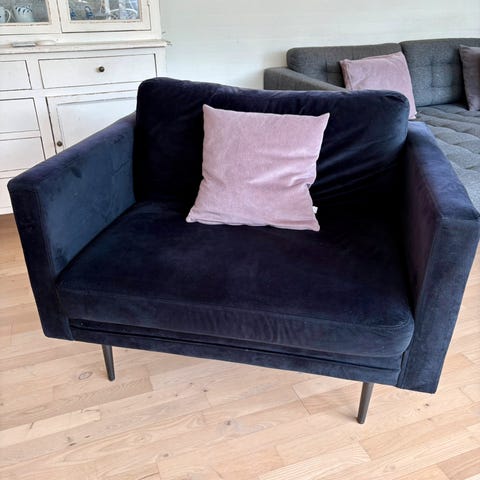 Velourstol i blommefarvet. Rigtig fin stand og behagelig at sidde i. Har ingen tydelige brugsspor og er passet godt på.