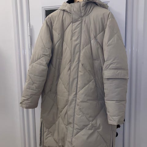 Varm vinterjakke / dunjakke / puffer med brede rib kanter ved hofte og ærmer. asymmetrisk lynlås lukning foran og stor bred krave. I mørke grøn farve. Den er størrelse L, men er lille i størrelsen og passer fint en str. 36/38.
