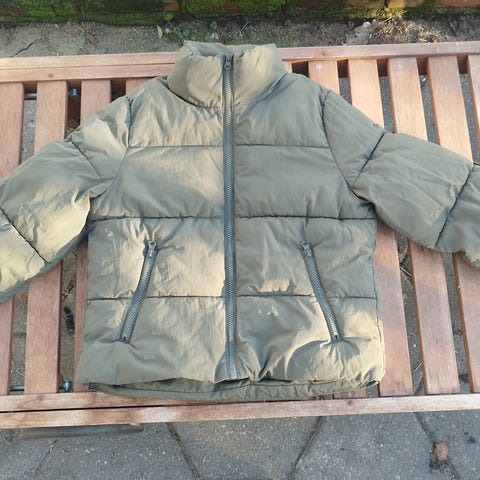 Puffer jacket in woven fabric with a detachable, lined hood. High collar and a zip down the front with a chin guard and fabric tab with a text print. Zipped side pockets and elastication at the cuffs and hem. The polyester content of the jacket is recycled.