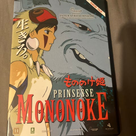 Studio Ghibli Prinsesse Mononoke DVD. Film i DVD-format med japansk originaltittel og coverillustration. Indeholder filmen Prinsesse Mononoke, en animationsfilm.