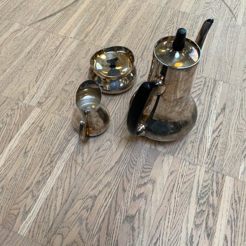 Sølvtøj, Kander, Div, Forskellige Pletsølv og en tin kande. Lille flødekande15 x 10 cm og 10 cm høj.
