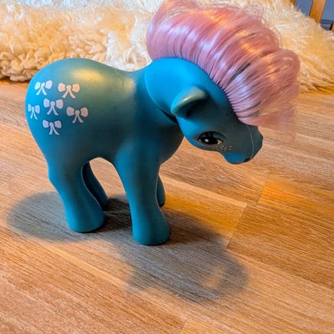 Pæn My little pony fra 1987. Original Hasbro pony. I meget pæn stand fraset en lille plet på det ene ben (se billeder). Håret er også overordnet i god stand, er dog en lille smule kruset helt ude i spidserne.