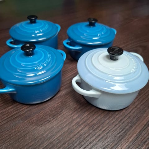 Le Creuset Mini Gryde Sæt består af fire små gryder i forskellige farver (sort, gul, lilla og blå). Gryderne er lavet af emaljeret stentøj, hvilket gør dem velegnede til tilberedning og servering af små portioner. Hver gryde har låg med håndtag og to sidehåndtag for nem håndtering. Sættet kan bruges til madlavning, opbevaring og servering.