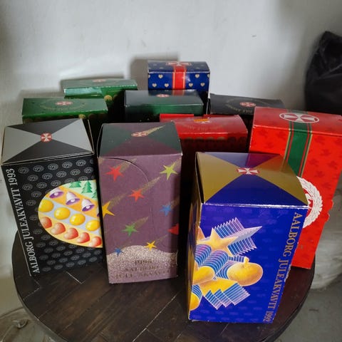 Flasker, Juleakvavit 1983 1986 2000, Aalborgs juleakvavit flaske fra året 1983 inkl. Æske kr 100. Og fra 1986 og 2000 uden æske kr 50 pr. Stk. uden banderole og indhold.