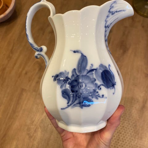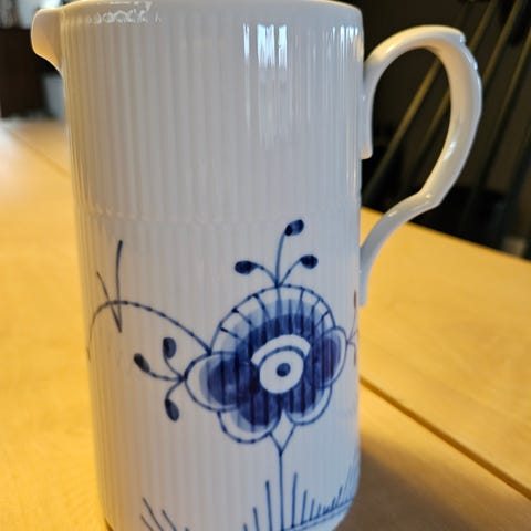 Royal Copenhagen Musselmalet Riflet kande i porcelæn med klassisk hvid og blå farve. Kanden har et håndmalet blomstermotiv og riflet struktur. Velegnet til servering af drikkevarer, pynt eller vase . Smuk kande, aldrig brugt. Nr.442.. 90 cl