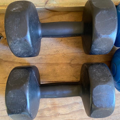 2,5 kg håndvægte med sekskantet form, belagt med sort gummi. Velegnet til styrketræning og fitnessøvelser.