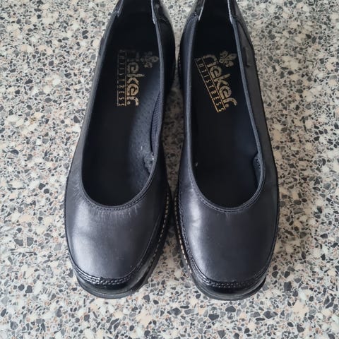 Rieker Loafers og sejlersko i størrelse 40. Skoene er sorte og lavet af materiale med synlige syninger på oversiden. Sålerne har mønster for bedre greb. Velegnet til hverdagsbrug.