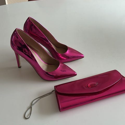 Zara højhælet sko i størrelse 39 med rød farve. Skoene har en firkantet tå og en bred hæl. Materialet fremstår som satin eller lignende stof. Designet inkluderer en polstret rem over tæerne og en smal ankelrem med spænde.