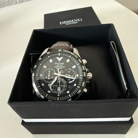 Herreur, Pulsar, Pulsar Chronograph. Herrearmbåndsur, stål. Sølvfarvet urskive med arabertal, stregindeks, chronograph funktioner, vandtæt 10 Bar, datorude. Urværk quartz. Urkasse ekskl krone Ø 39 mm. Org. rem med spænde L. 21 cm. Bagkapsel nr. 7T62-X130.