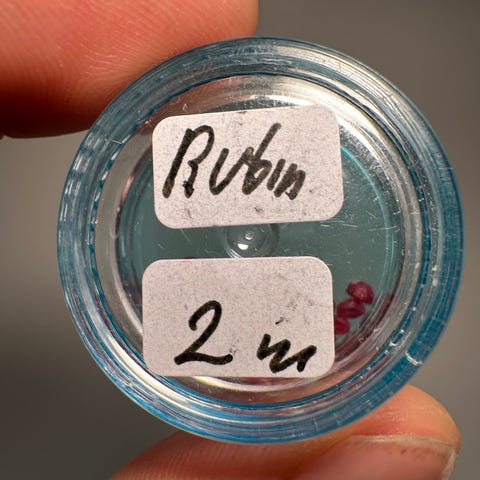 Naturlige rubiner købt i Jaipur. Sættet består af 12 facetterede sten i størrelsen 6 x 4 mm med en samlet vægt på 4,65 carat. Stenene er opaque og af kommerciel kvalitet, velegnet til smykkefremstilling eller samlere.